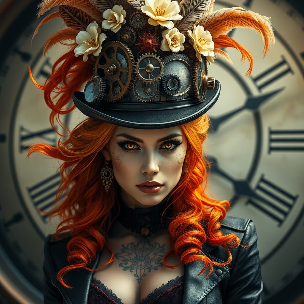 A striking portrait of a steampunk woman with piercing eyes, surrounded by intricate swirling tattoos and a majestic top hat adorned with gears and feathers. Influenced by digital fantasy art, this image showcases a blend of industrial and mystical elements.