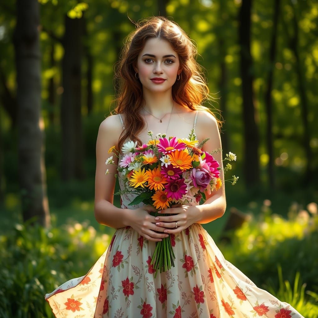 A young woman in a sundress holds a flower bouquet in a sunlit forest. The image evokes art nouveau aesthetics with intricate details and a soft, ethereal quality.