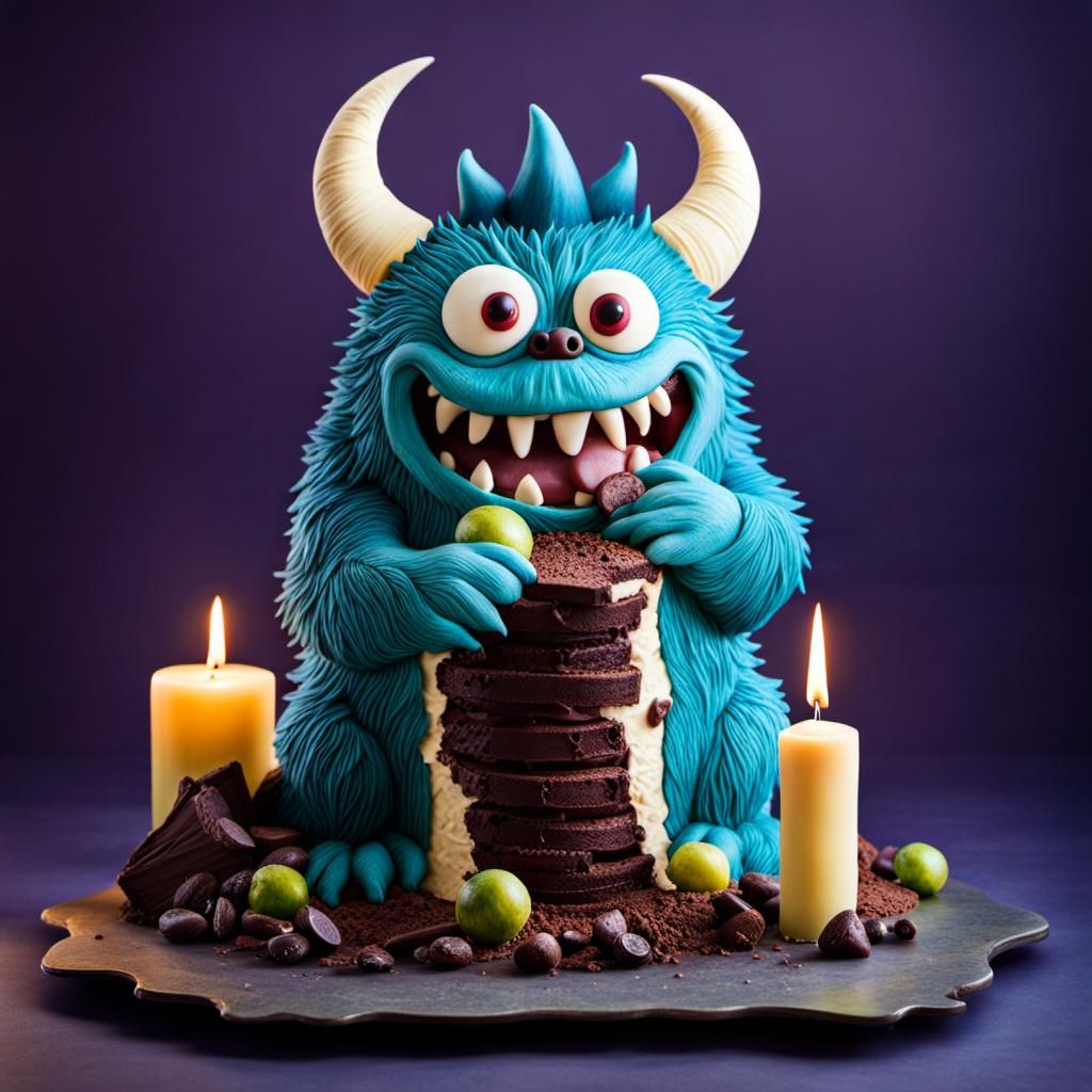 a birthday cake sculpture of an (adorable storybook_monster) with a slice cut out of it, made of cake, modeling chocolate, food coloring, Swiss Meringue buttercream, trending on Pinterest, Reddit, monster cake, monster made of cake, meticulously detailed, delicious, fun parry background, with a birthday ...