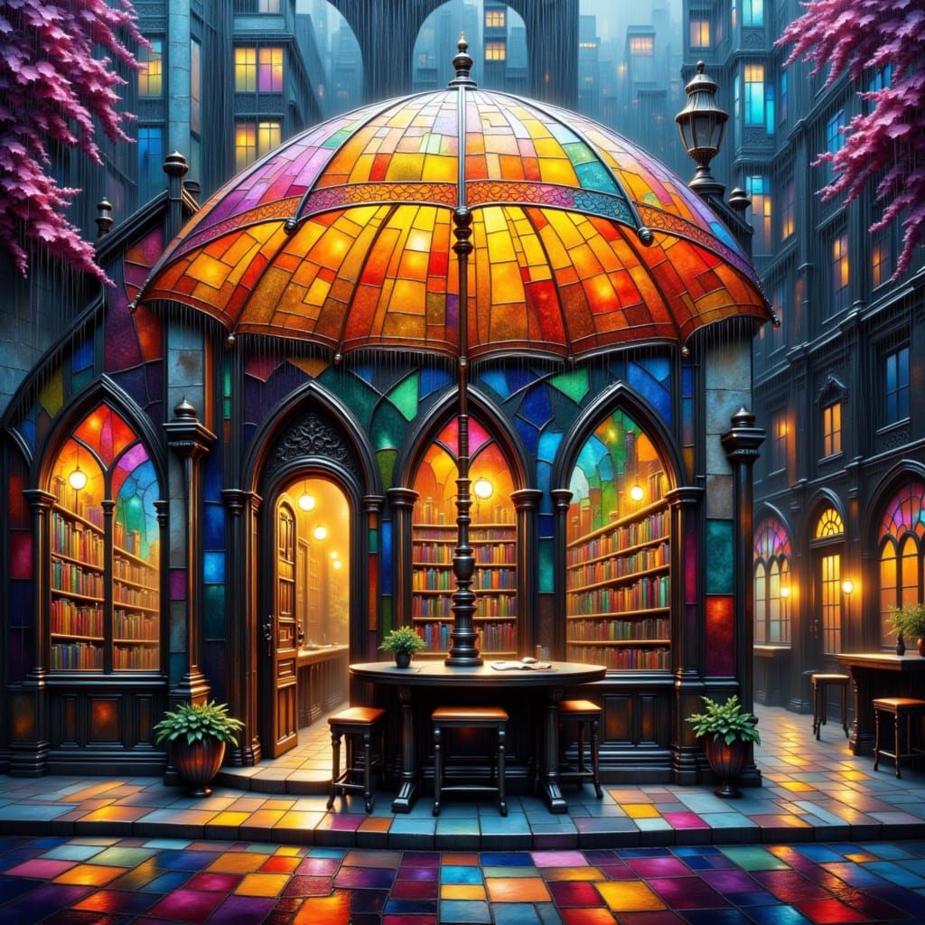 This surreal oil painting shows a giant stained glass umbrella protecting a cozy library from a downpour. Abstract rain patterns and dramatic lighting create a whimsical fantasy scene.