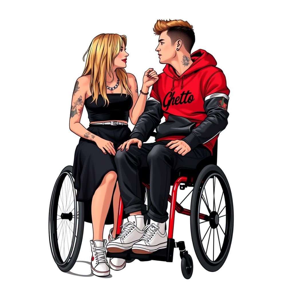 This vibrant image depicts a loving couple, the woman in a black mini kilt and red crop top, the man with long, braided hair and a sleeveless leather jacket, both looking tenderly at each other. The man is in a wheelchair, surrounded by streetwear and punk details, in a style that blends Murakami's color...