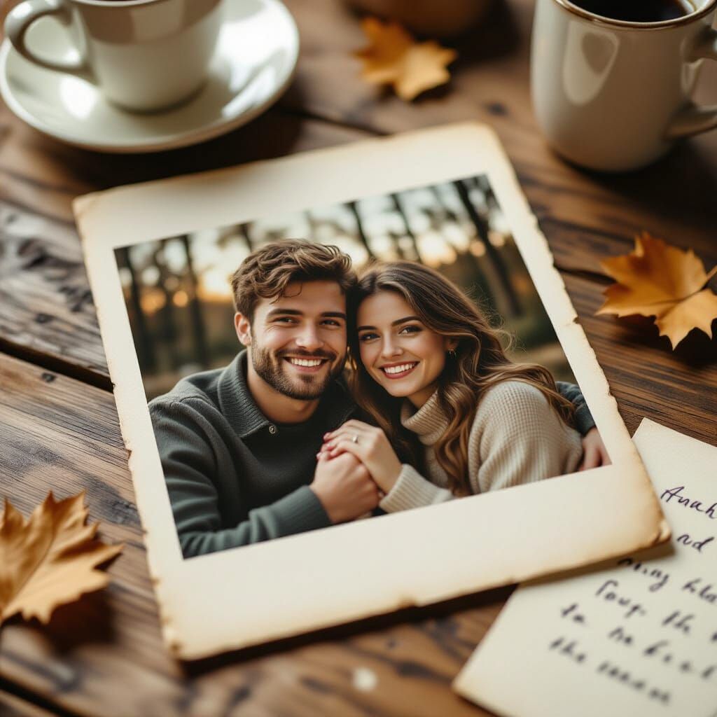 This image captures a vintage-style photograph of a young couple holding hands and smiling. The grainy, muted tones and warm light leaks create a nostalgic and emotional atmosphere, complemented by a coffee cup, leaf, and note.
