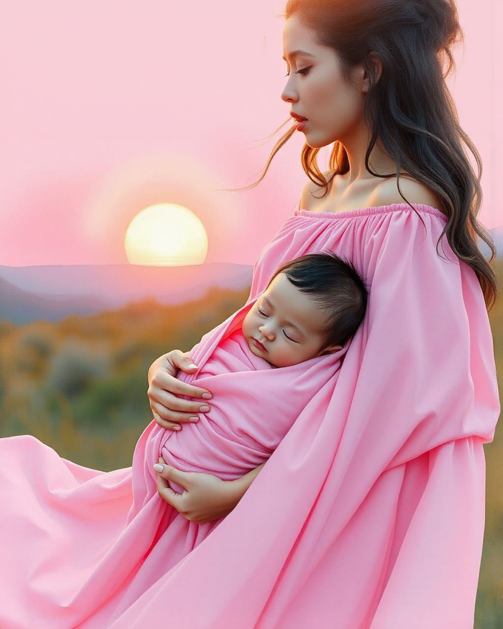 A serene image of a woman in a pink dress holding a baby wrapped in a pink blanket at sunset. The artwork is rendered in a modern, surreal watercolor style.