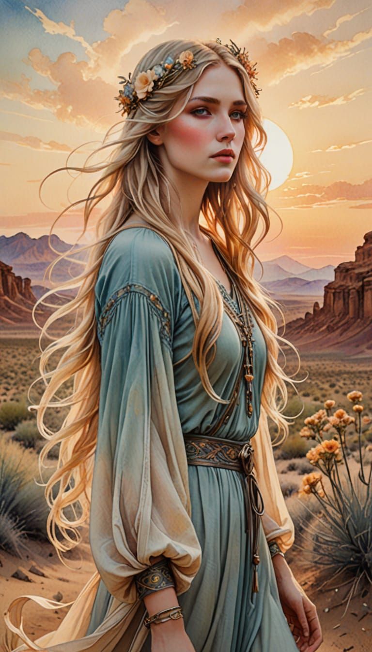 This image showcases a young woman in a stunning Art Nouveau watercolor painting, set against a desert backdrop. Soft, golden lighting and muted pastel colors create a captivating scene, with delicate lines and ornate floral motifs adding to the beauty of the subject's athletic physique.