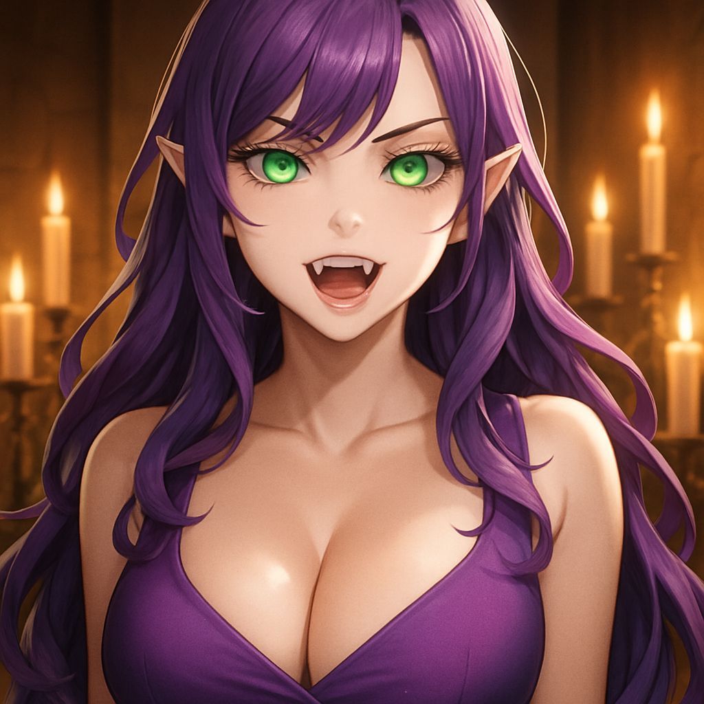 This enchanting image depicts a stunning vampire with long purple hair, donning a lavish purple dress, and exuding mystique in a dimly lit room, illuminated by the soft glow of candles, with piercing green eyes and razor-sharp fangs