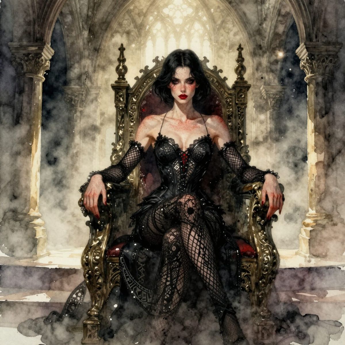 This fine-art gothic watercolor features a strong, dark-haired queen seated regally on an ornate throne in a misty, vast hall. The image uses a restrained palette with crimson accents and dramatic chiaroscuro lighting.