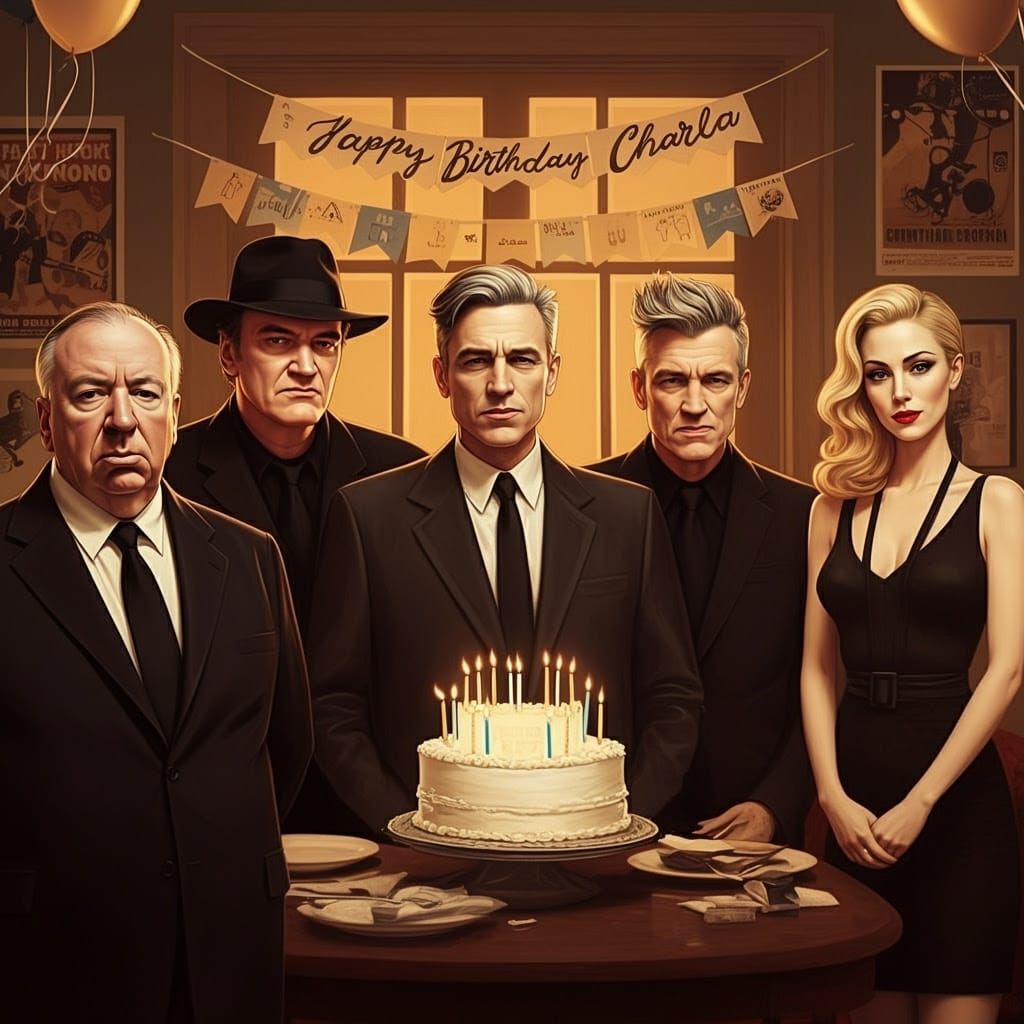 A warmly lit living room scene with vintage film posters features a 'Happy Birthday Charla' banner over a cake with flickering candles. Iconic film characters stand smiling in this digital art piece.