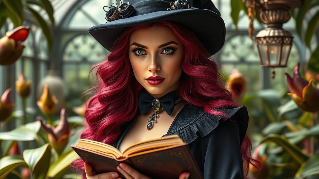 This image shows a stunning young woman surrounded by exotic carnivorous plants in an opulent French glasshouse. Detailed, cinematic, and atmospheric, with a focus on deep colors and intricate detail.
