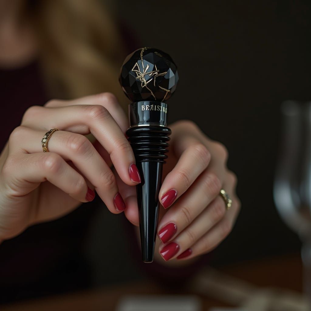 This image shows a woman carefully holding a black crystal bottle stopper in her hand. The focus is on the delicate interaction with the object.