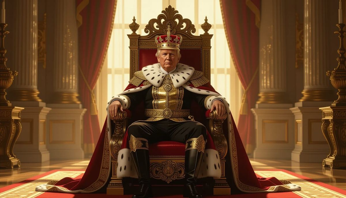 A regal depiction of Donald Trump as a king, seated on a grand throne in an opulent White House throne room. The image features dramatic lighting and a style blending historical portraiture with modern digital painting.