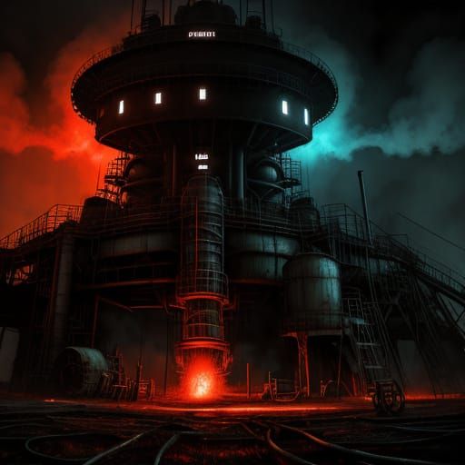 This image shows a worker suffering from pneumonoultramicroscopicsilicovolcanoconiosis in a dark, industrial factory setting. Created as a vibrant oil painting with surreal and sci-fi elements, the scene is cast in dim red lighting.