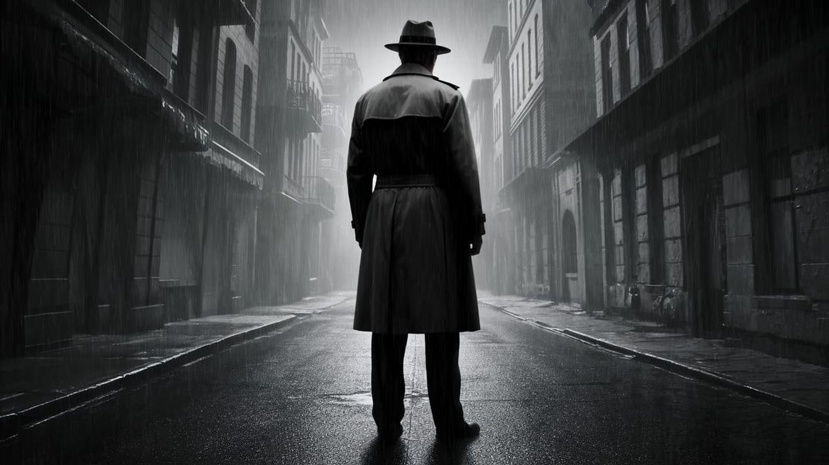 This haunting black and white image captures a lone figure in a deserted street, surrounded by crumbling buildings and shrouded in mist and rain. A classic film noir scene, evoking a sense of mystery and intrigue.