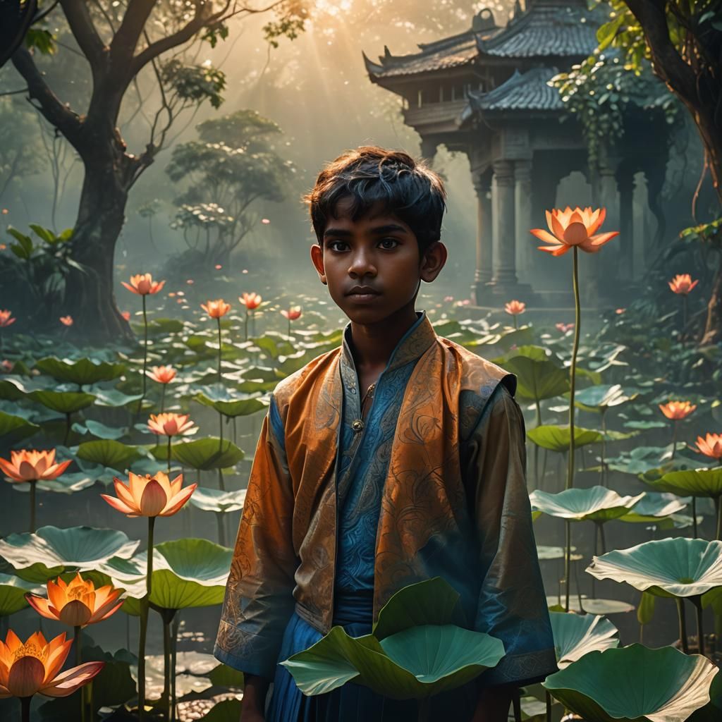 This image shows a Sri Lankan boy in a lotus garden bathed in warm sunlight. The hyper-realistic digital art features intricate details, vibrant colors, and a mystical, cinematic atmosphere.