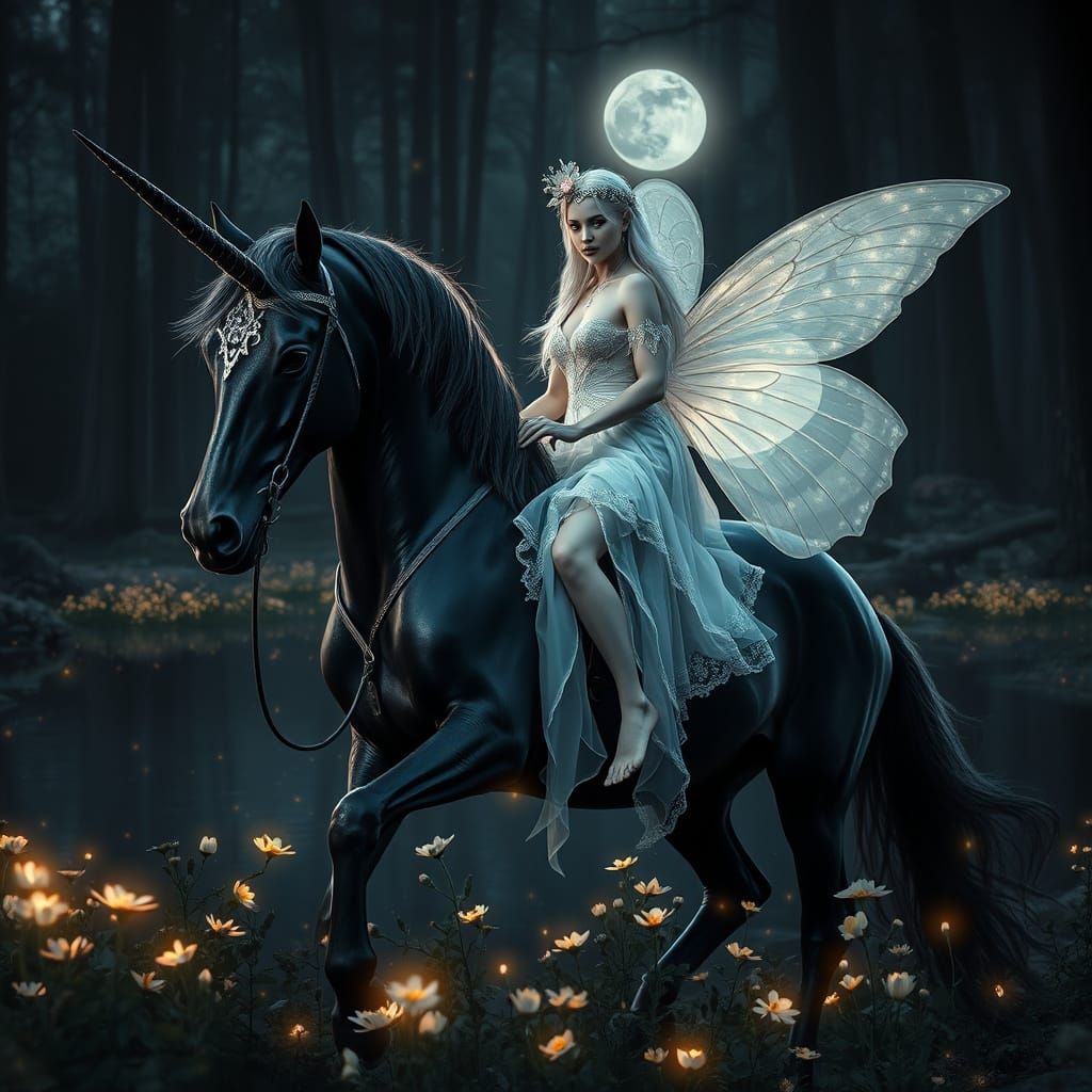 <lora:DreamweaverFlux:1.0>hyperreal artistic and photographic portrait of a breathtaking fairy in a (contrasted lights) dark forest by a lake, at night, and riding a shiny black impressive unicorn, and as they step, magnificent flowers blossom with warm bioluminescent light. etheral, with soft glowing ...
