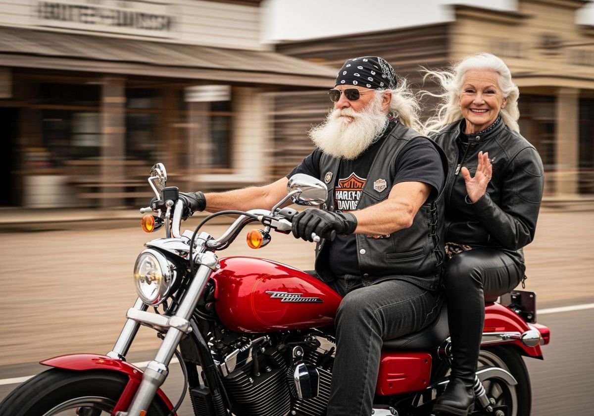 This image shows an elderly couple riding a vintage motorcycle down Route 66. The bikers are dressed in leather, and the background suggests a historic Western town, rendered with natural lighting.