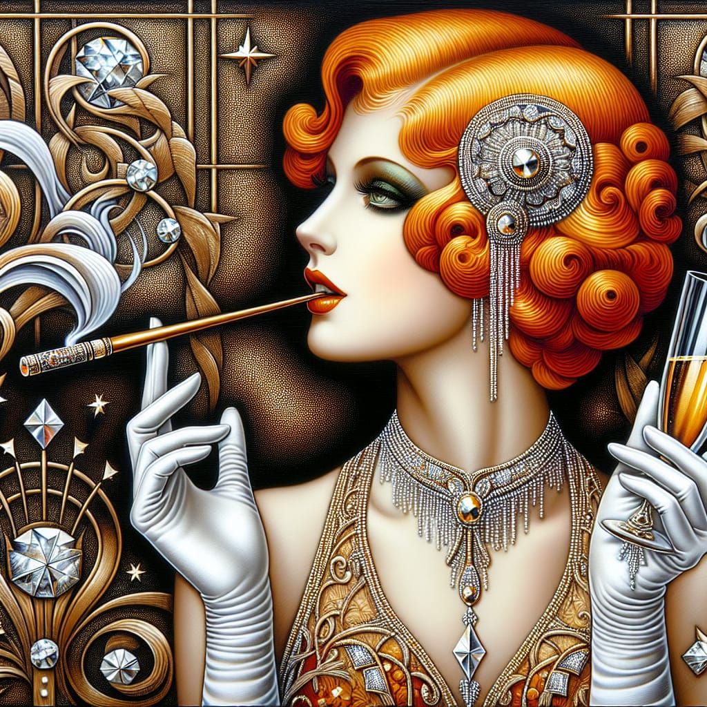 A Caucasian flapper girl with vibrant orange hair, dressed in an art deco style, smoking a finely ornamented cigarette holder studded with diamonds. In her hand, she holds a glass of champagne, amidst an environment rich in stars and diamonds. The scene is painted with intricate patterns, and shimmering ...
