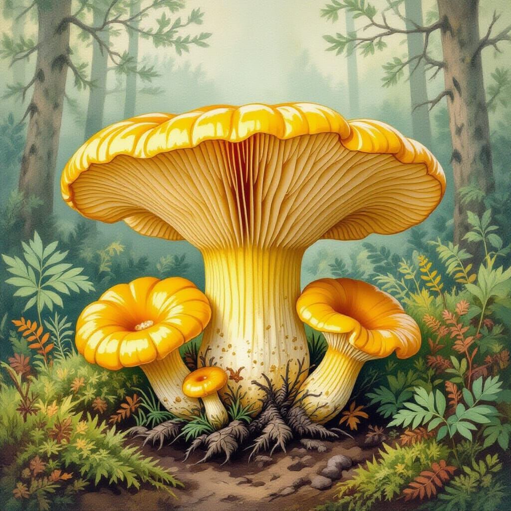 Step into a storybook forest with this enchanting watercolor illustration of Cantharellus cibarius, better known as the golden chanterelle. This beloved woodland mushroom is depicted with a radiant yellow, funnel-shaped cap and delicate, ruffled gillsβtenderly emerging from a dreamy, mossy forest floor. Rendered in a vintage botanical style with a soft, earthy palette, this charming artwork blends scientific precision with fairy-tale whimsy. Perfect for fungi fanatics, foragers, and forest romantics alike. Yes, itβs mushrooming with character.