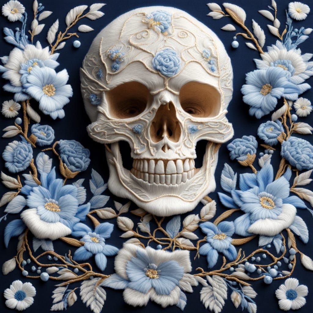 This image shows a white skull intricately adorned with blue floral needlework. The hyperrealistic art style creates a visually striking and detailed composition.