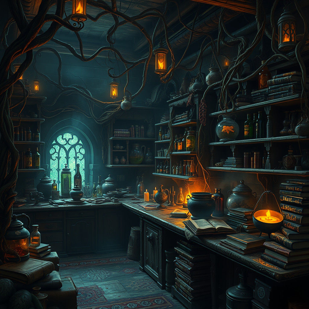A magical witch's lair filled with potion bottles, cauldrons, and spell books. This image shows a mysterious workspace with twisted vines, rendered in exquisite detail as digital art.