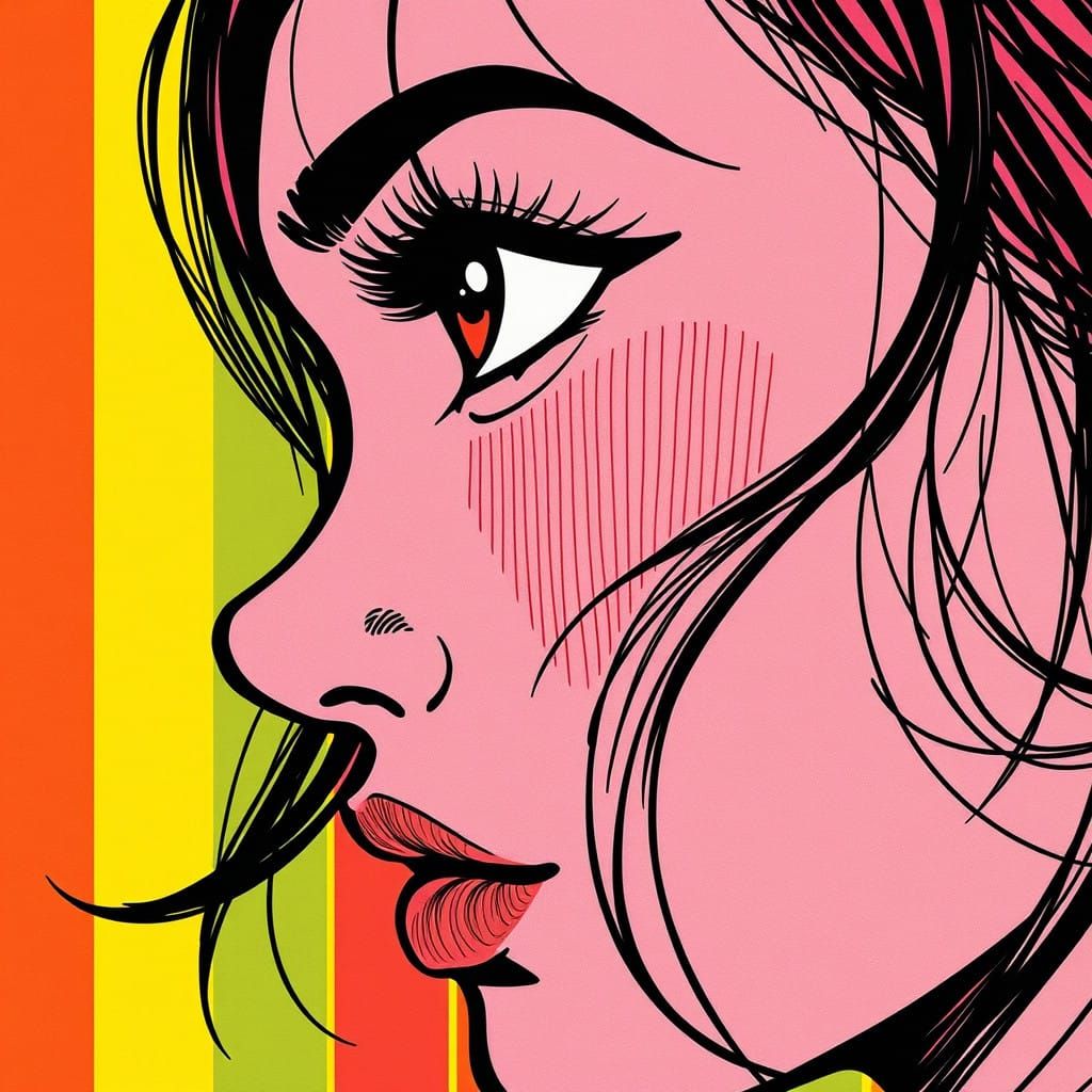 A striking anime-style portrait of a woman's face, created with bold black linework and vibrant, colorful stripes in a linoleum block print aesthetic, reminiscent of classic Japanese pop art and manga illustrations.
