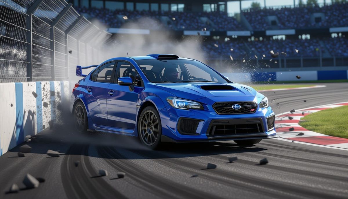 This image shows a Subaru WRX STI losing control and crashing on a race track. Hyper-detailed charcoal rendering captures flying debris and dynamic motion with realistic textures and dramatic lighting.
