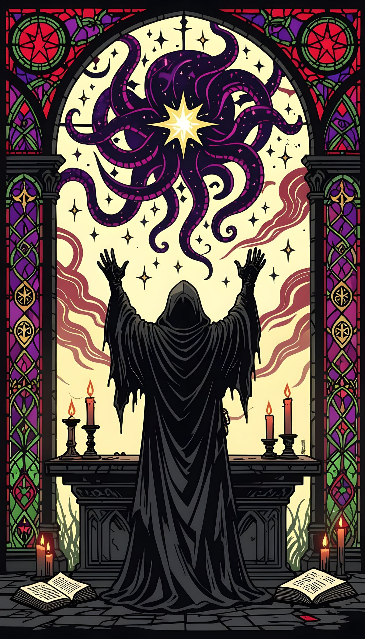This image shows a cloaked cultist at an altar, beckoning a cosmic entity. The scene features lit candles and arcane symbols in a stained glass art style. Bold outlines and eerie colors add to the gothic aesthetic.