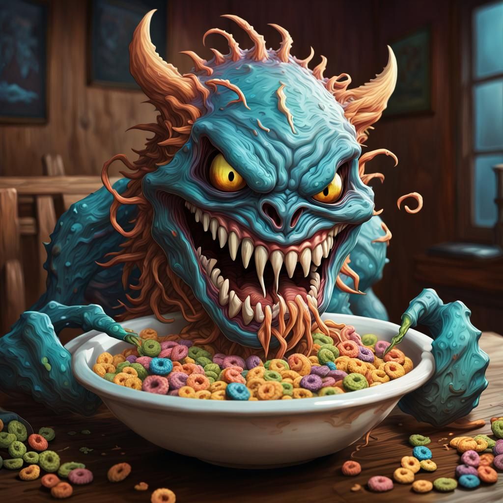 A hyperrealistic image shows a monstrous creature enjoying cereal at a table. The scene is richly detailed with dramatic lighting and a colorful backdrop, emphasizing the creature's twisted features.