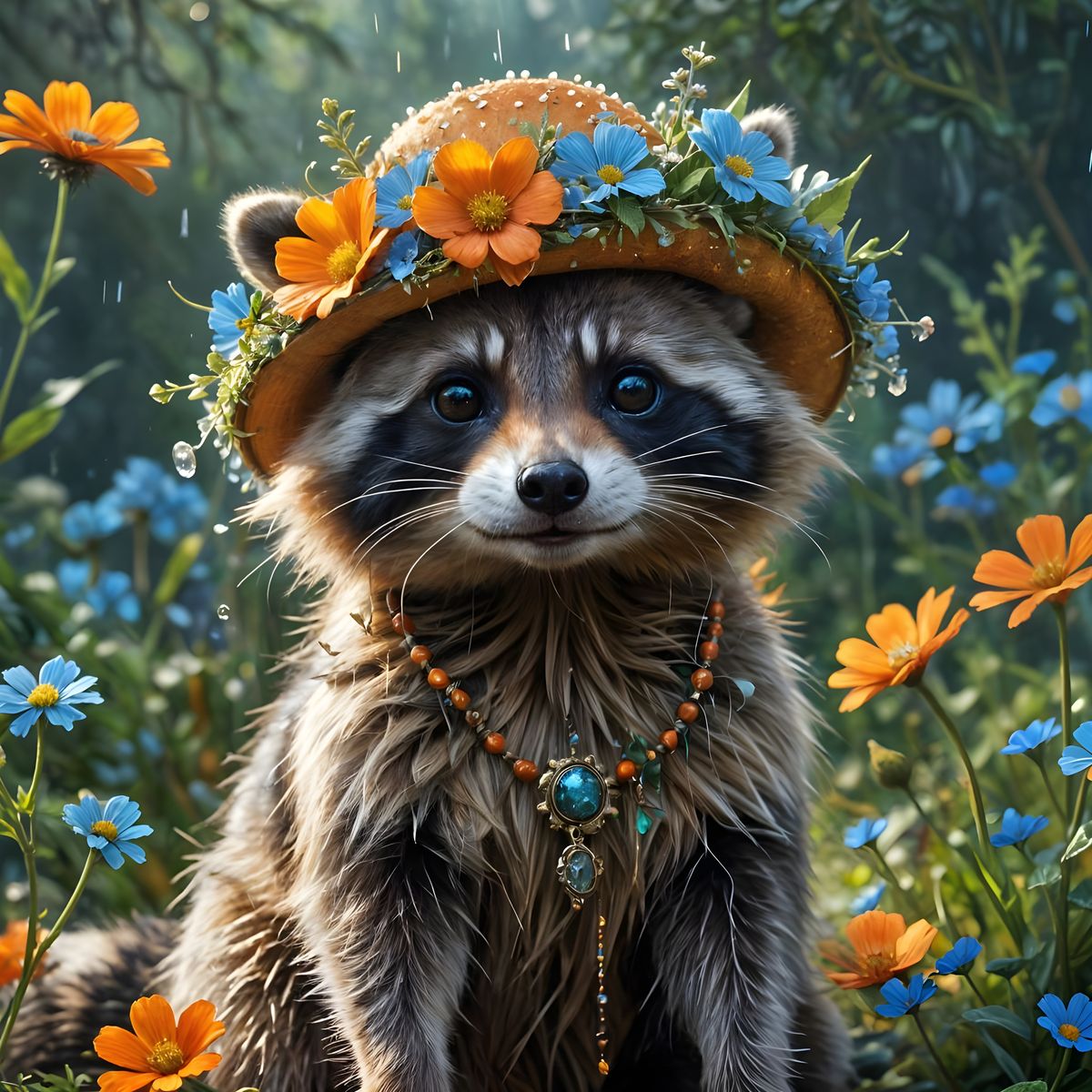 This image shows a detailed concept art piece of a raccoon adorned with a flower hat and beaded jewelry, featuring dew drops, moss, and tiny blue flowers. The art style uses dynamic lighting and triadic colors.