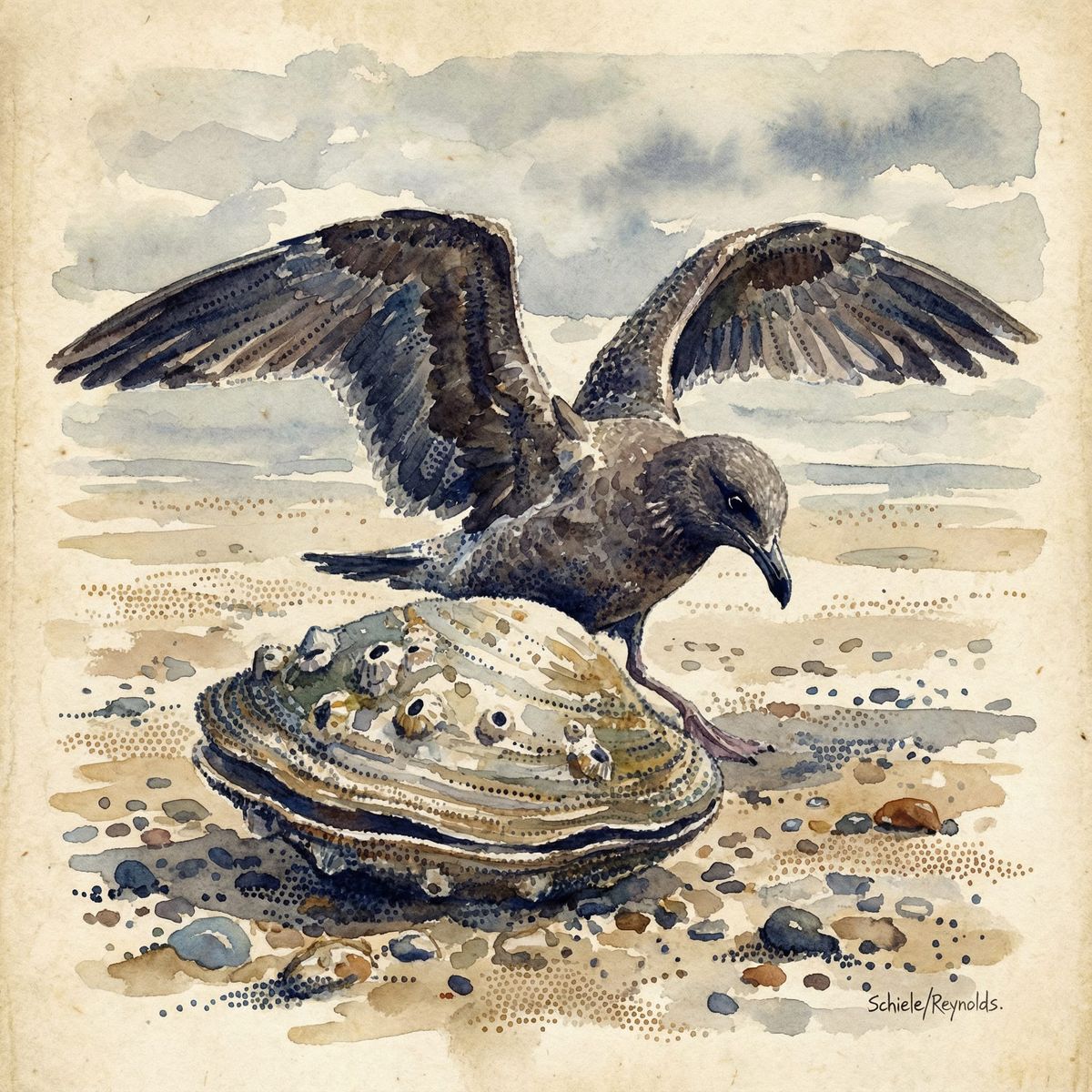 This image depicts a proud seagull with wings spread, attempting to open a large clam on a beach. Rendered in watercolor with pointillist and impressionist influences.