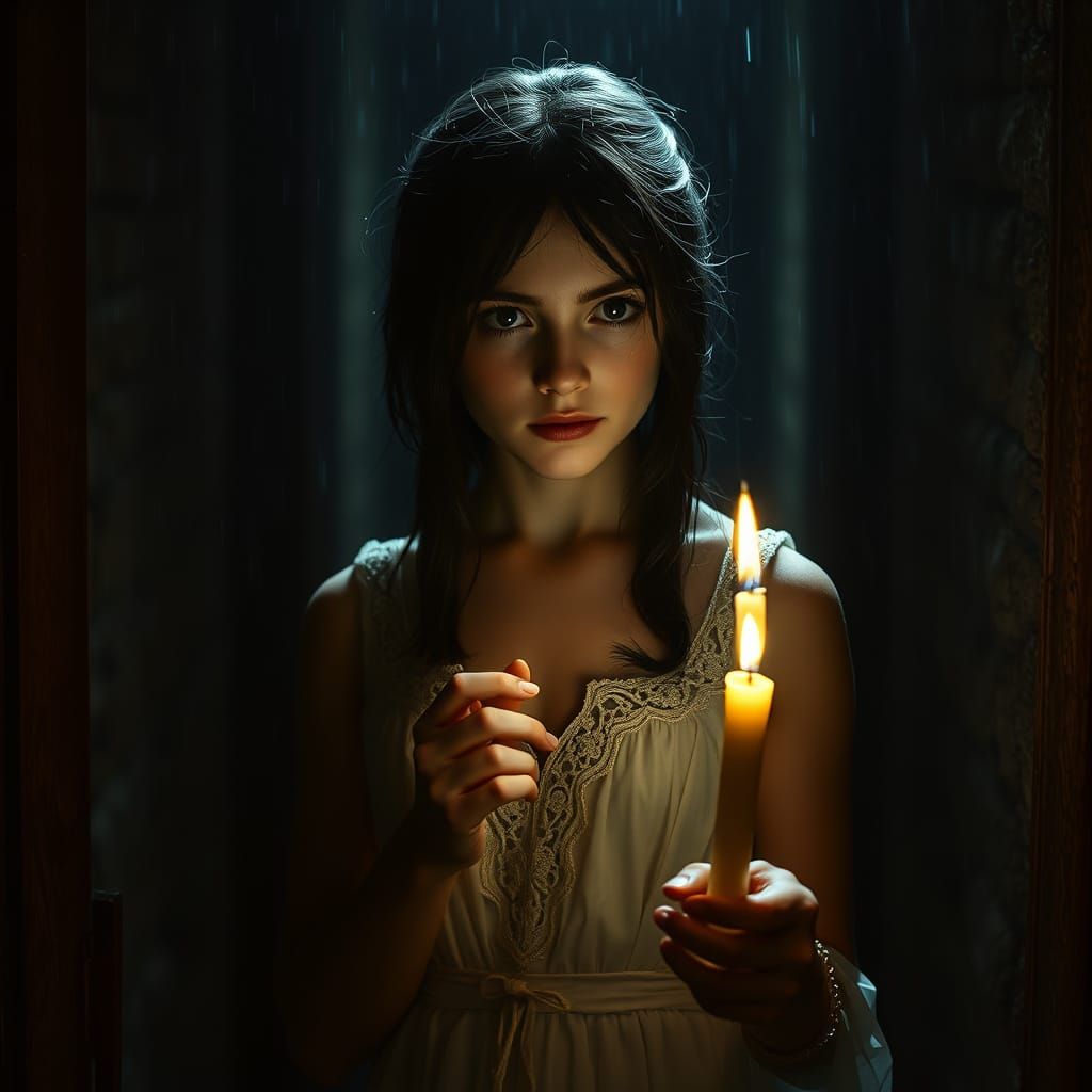 A haunting portrait of a woman in a tattered white gown, standing in a dimly lit, abandoned castle hallway, surrounded by eerie shadows and the sound of distant thunder, with a warm, golden color palette reminiscent of 35mm film stock.