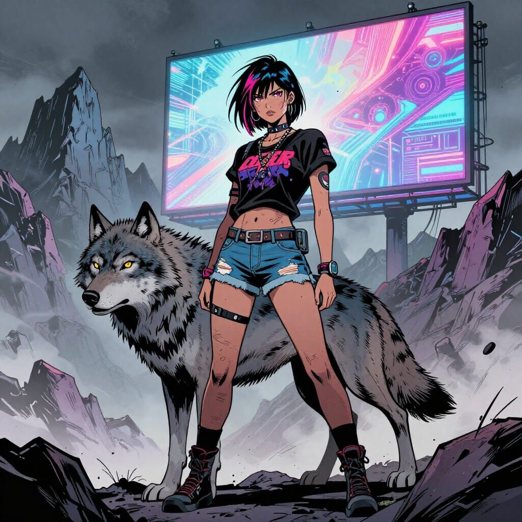 This image depicts a bold comic-style scene of a cyberpunk girl and a wolf in rugged mountains. Features dynamic outlines, saturated colors, and dramatic lighting.