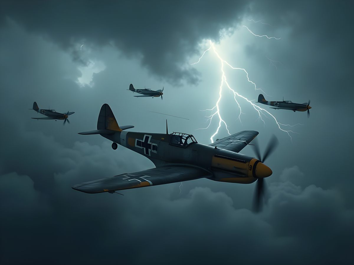 This dramatic image shows a squadron of classic Messerschmitt Bf 109 warbirds flying through a dark and ominous storm cloud, with flashes of lightning illuminating the scene. The planes are meticulously detailed with weathering and battle scars, reminiscent of World War II aviation photography.