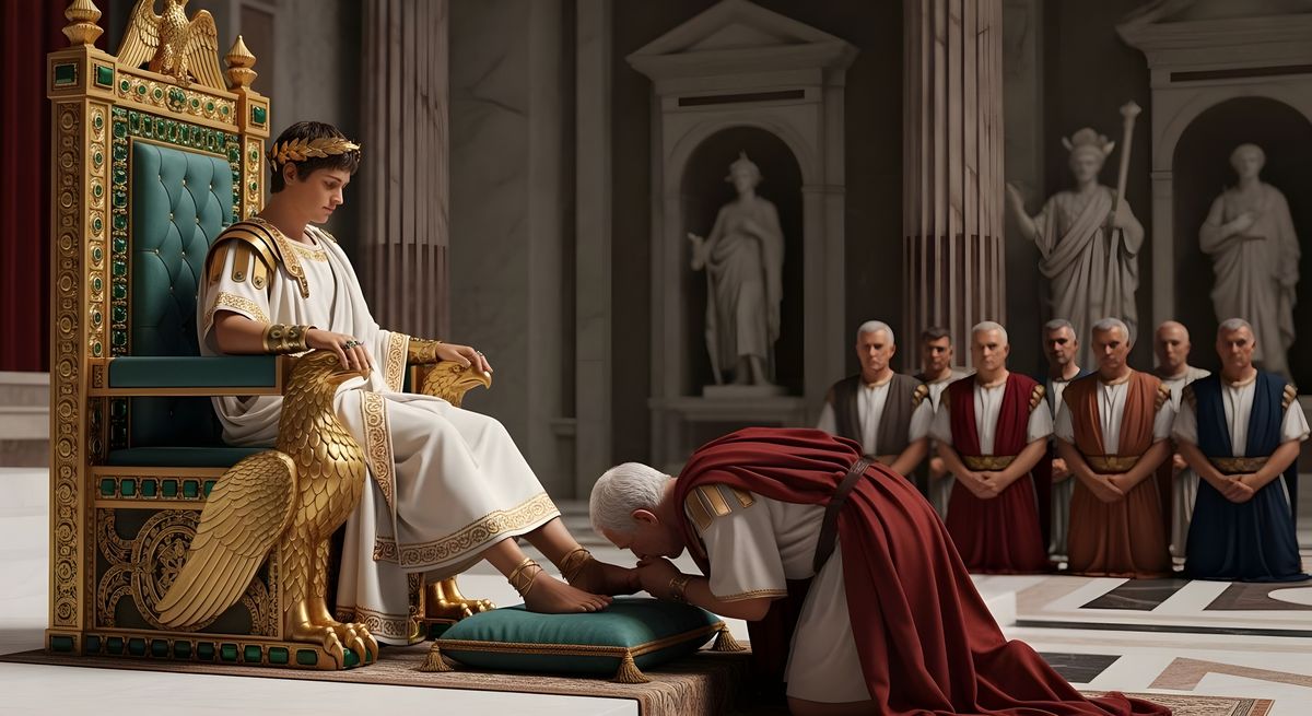 This image depicts a young Emperor Nero barefoot on a golden, jewel-encrusted throne in an opulent Roman palace. A senator kneels in homage before him in this wide-angle professional photograph.