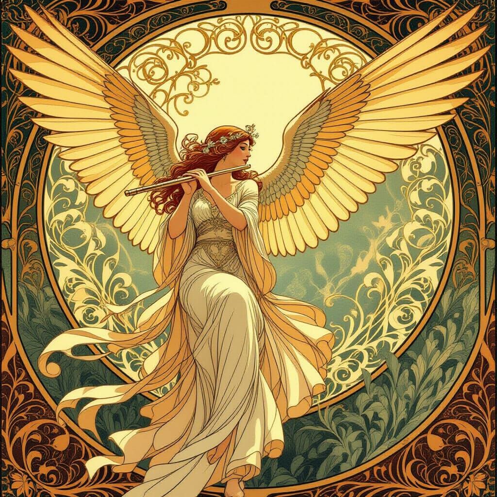 This Art Nouveau illustration features a majestic bird with flowing wings playing a flute. Gentle golden light and fine linework create a dreamlike atmosphere with organic curves.