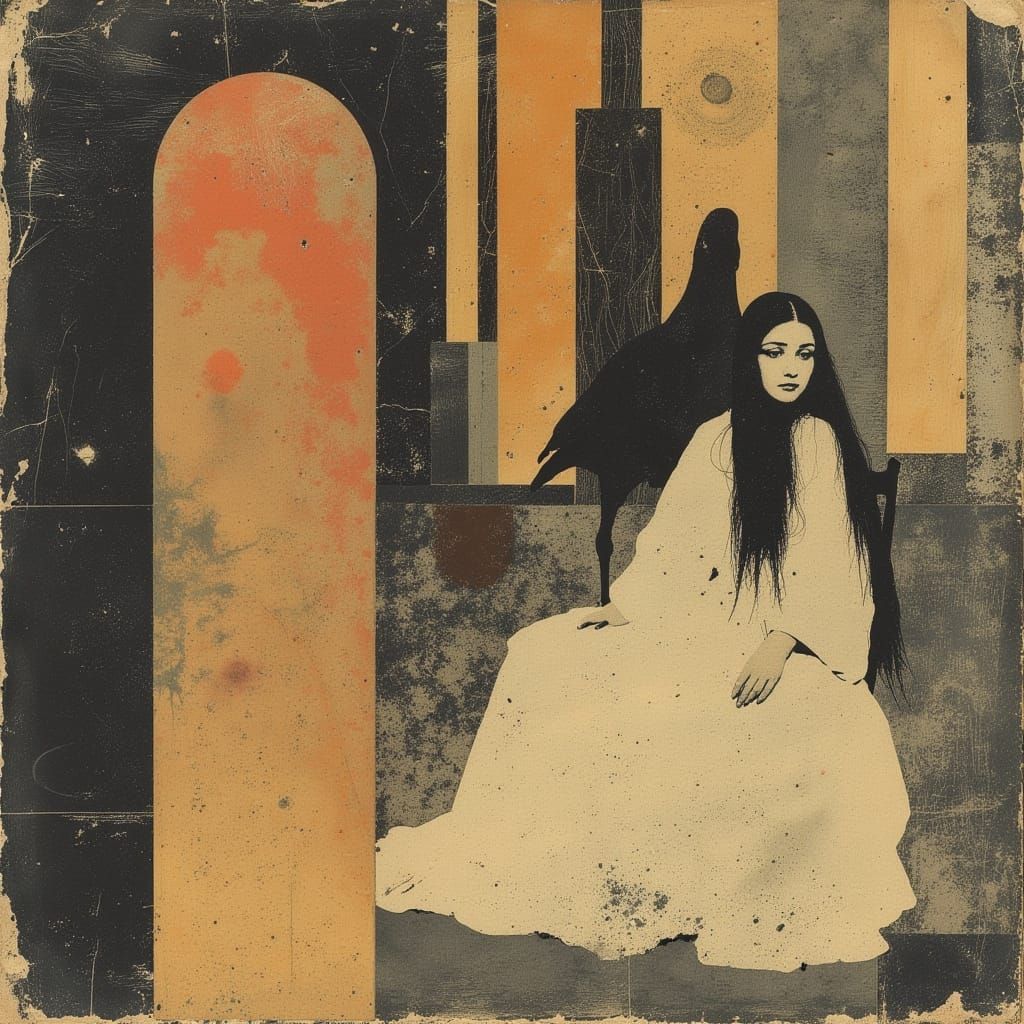 This image shows a seated woman in a white gown, evoking Modigliani's style. The artwork features long black hair, minimal facial details, and an abstract geometric background with warm earthy tones.