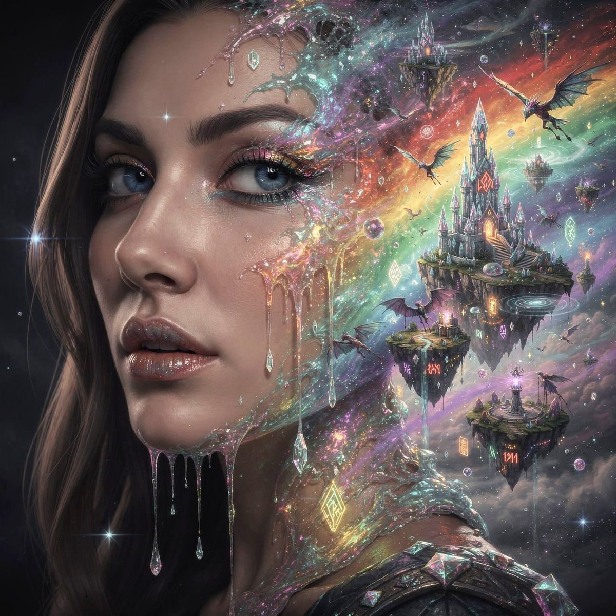 A woman's face melts into a mysterious and dreamy rainbow oblivion, full of magical, hyperdetailed, mythical details. The oblivion contains a separate fantasy reality. Volumetric lighting, extreme contrast, ultra sharp focus, crystal clear, sparkling, vibrant, fantasy core, dark fantasy, fantasy realism. ...
