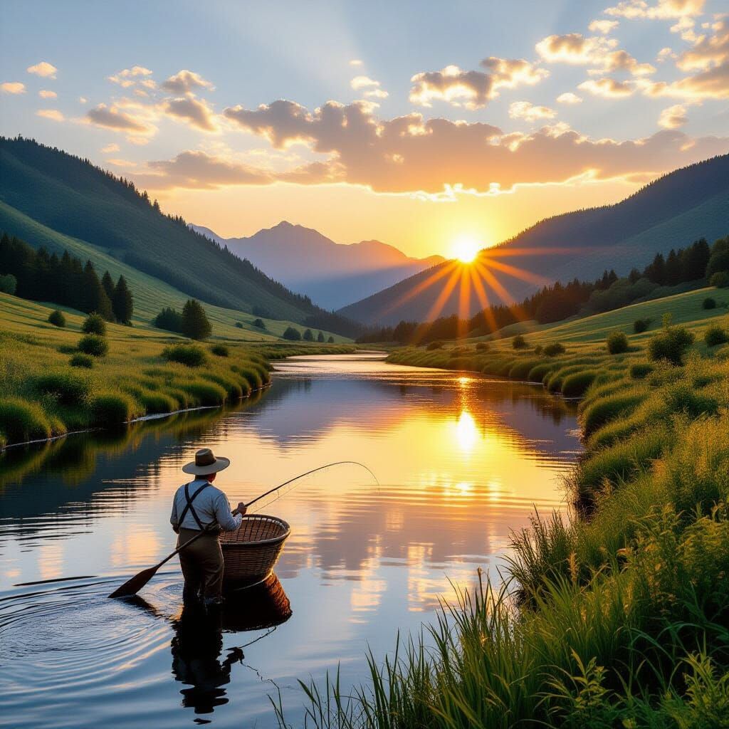 A serene river meanders through a lush valley, with rolling hills and distant mountains. A lone fisherman casts his line in the golden sunset light in the style of landscape painting.
