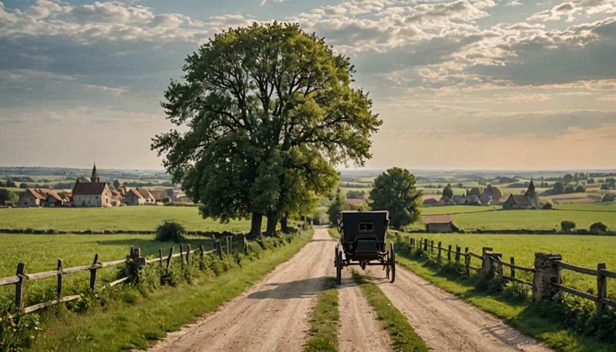A scenic view of a solitary country road winding through open fields. A horse-drawn carriage appears on the horizon, with a medieval village gate in the far distance.