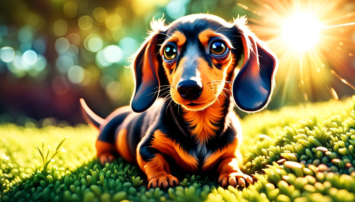 This image shows a charming dachshund puppy basking in sunlight. The rendering features dynamic lighting, a vibrant color palette, and hyperdetailed textures. The image captures the puppy in a playful, inviting pose.