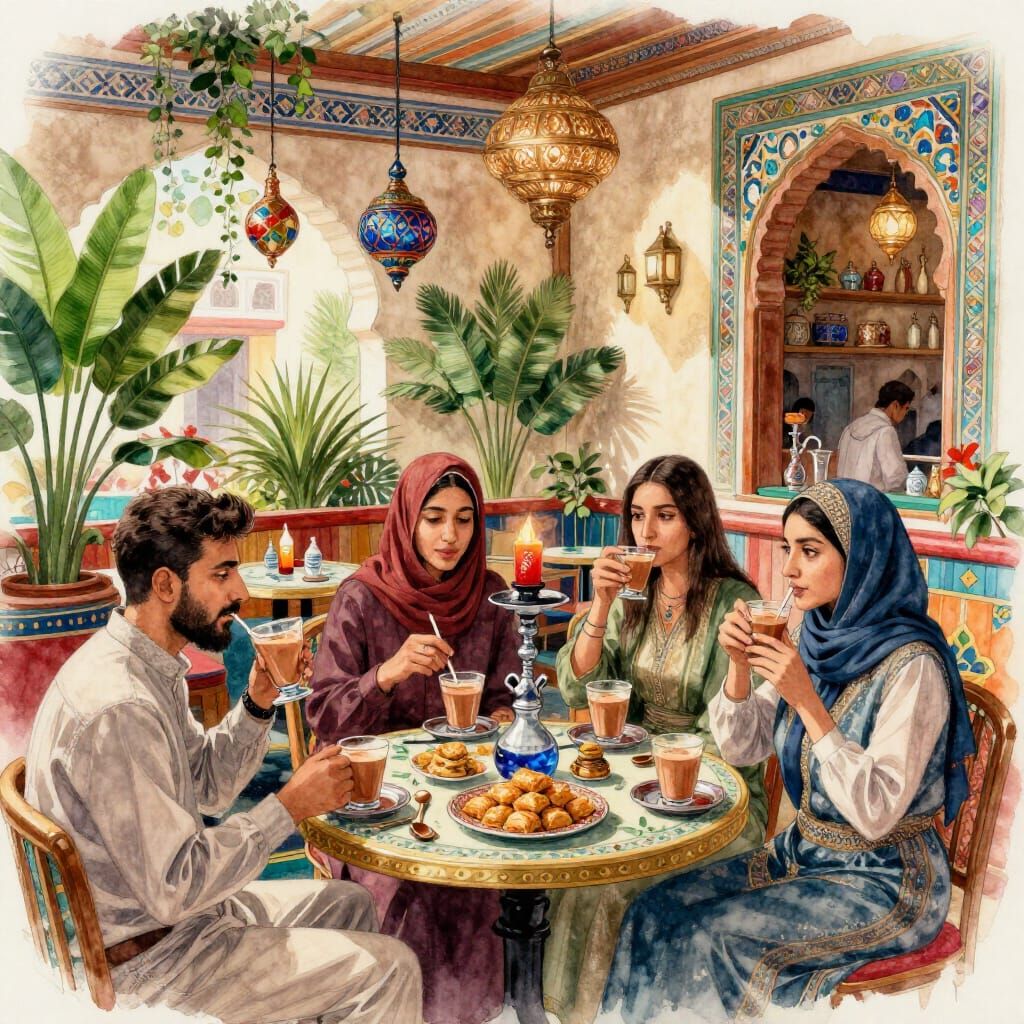 This watercolor painting captures a vibrant Moroccan cafe interior, filled with plants, oriental candles, and patrons enjoying chai, baklava, and shisha.