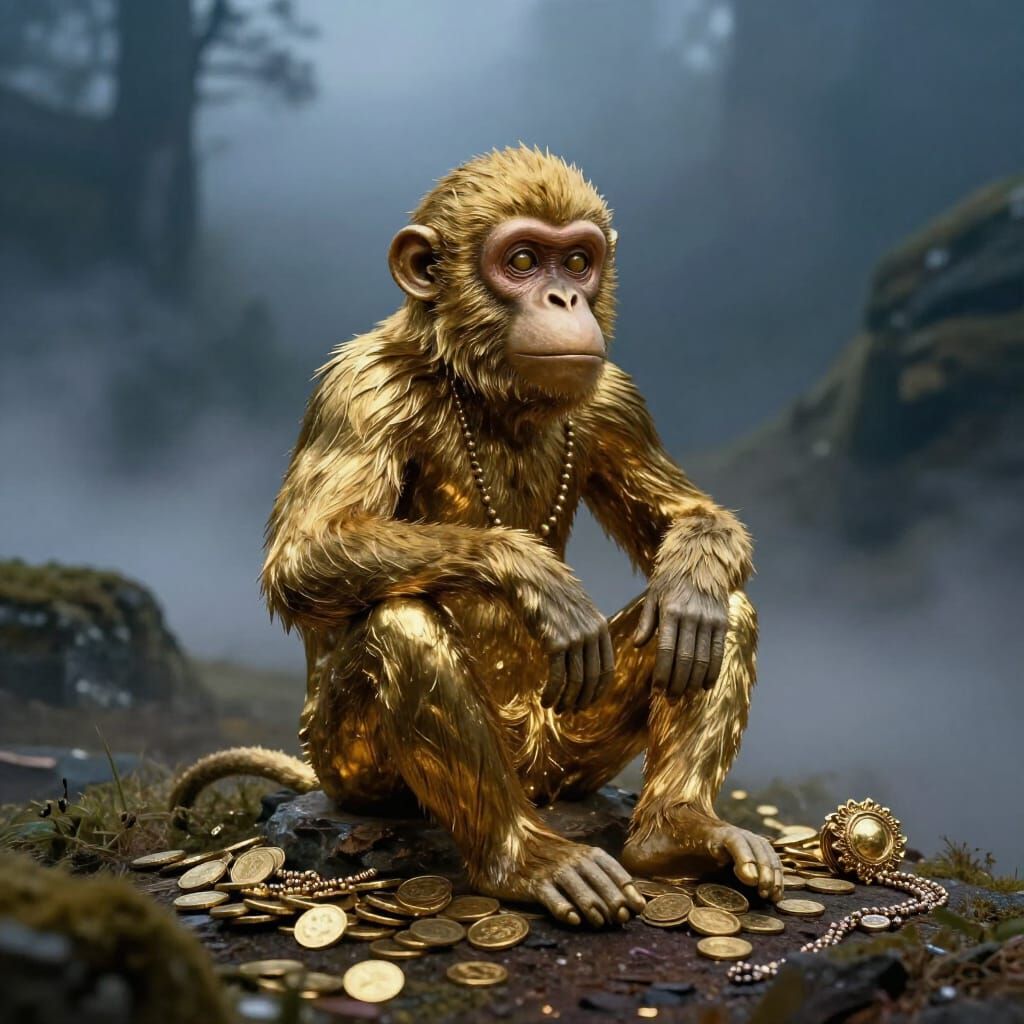 This hyperrealistic image shows a solid gold monkey statue on an ancient, misty hill. The ground is covered in scattered gold coins and jewelry, rendered with cinematic lighting and volumetric fog.