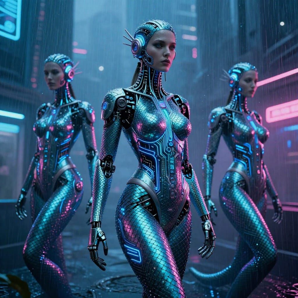 This image shows futuristic female robots with bioluminescent circuits in a rainy, neon-lit city. The hyperrealistic artwork creates a dramatic and alluring atmosphere.