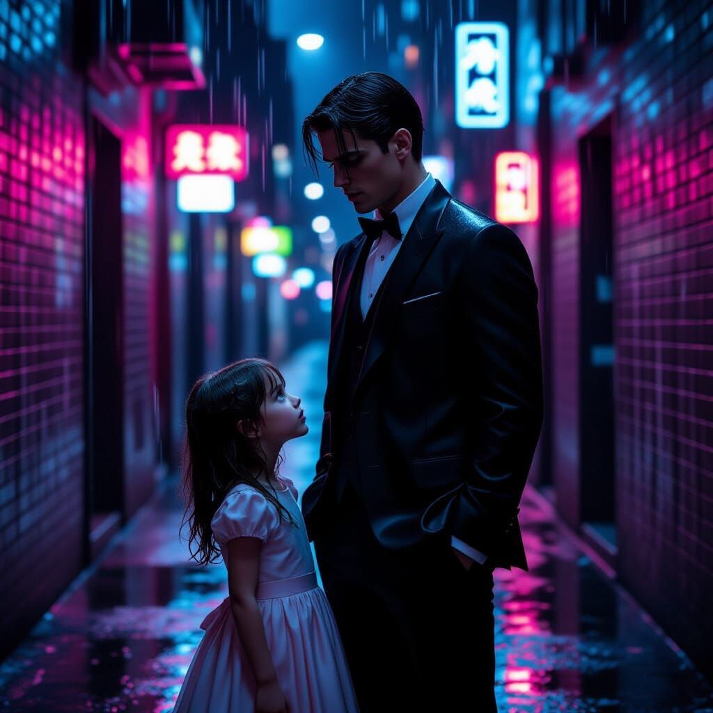 This image shows a mafia boy in a tailored suit standing protectively next to a young girl in a pastel dress in a rain-soaked, neon-lit alley. The image is a cinematic masterpiece with bold, high-contrast lighting.