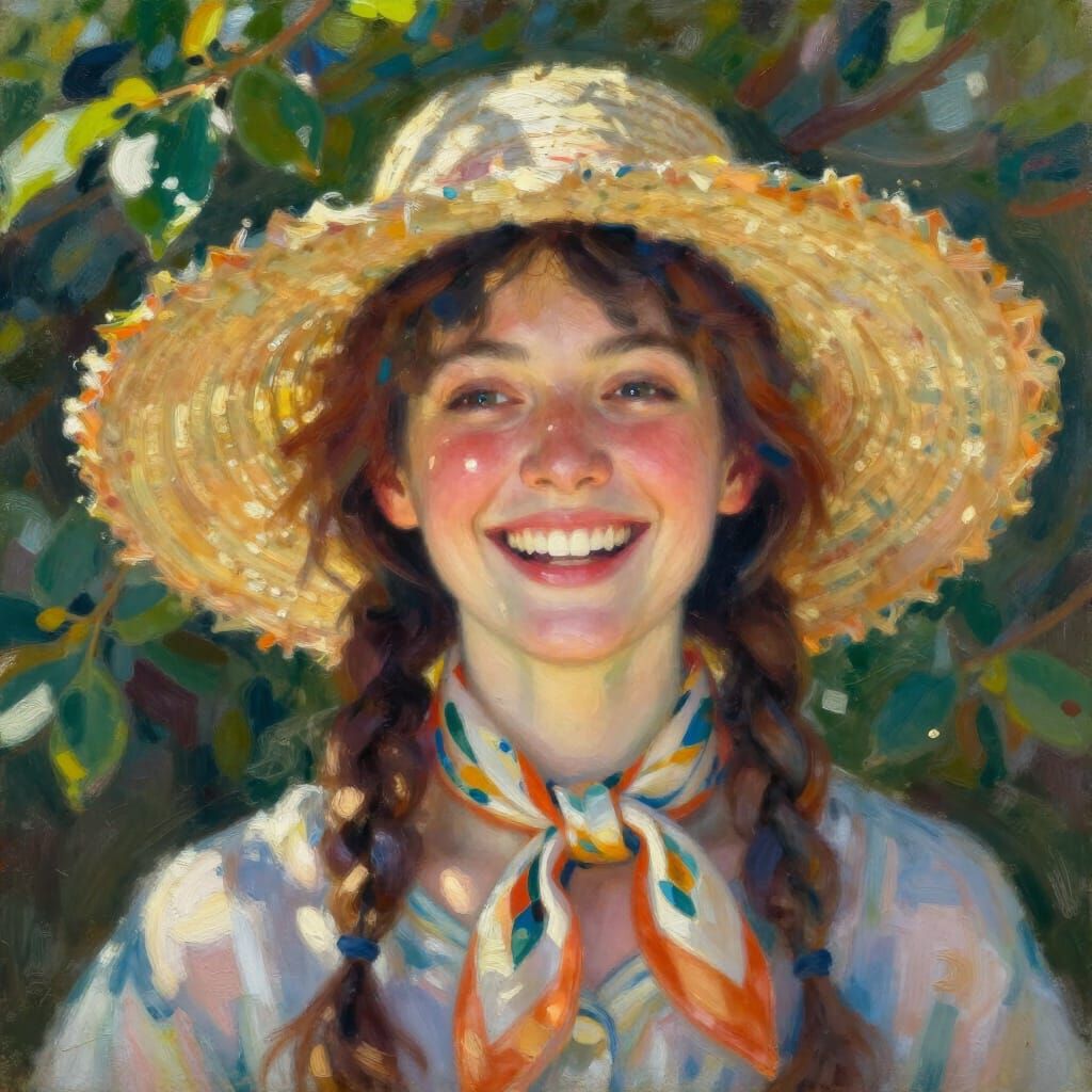This image depicts a joyful woman with sparkling eyes, bathed in dappled sunlight. Rendered in a vibrant, impressionistic oil painting style with energetic brushstrokes, it captures fleeting happiness.