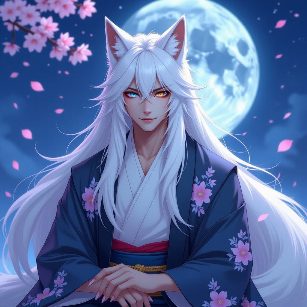 This image shows a charming male kitsune with long white hair, captivating eyes, and multiple fox tails, dressed in a floral kimono under a moonlit sky with falling sakura petals. Rendered in a detailed anime style.