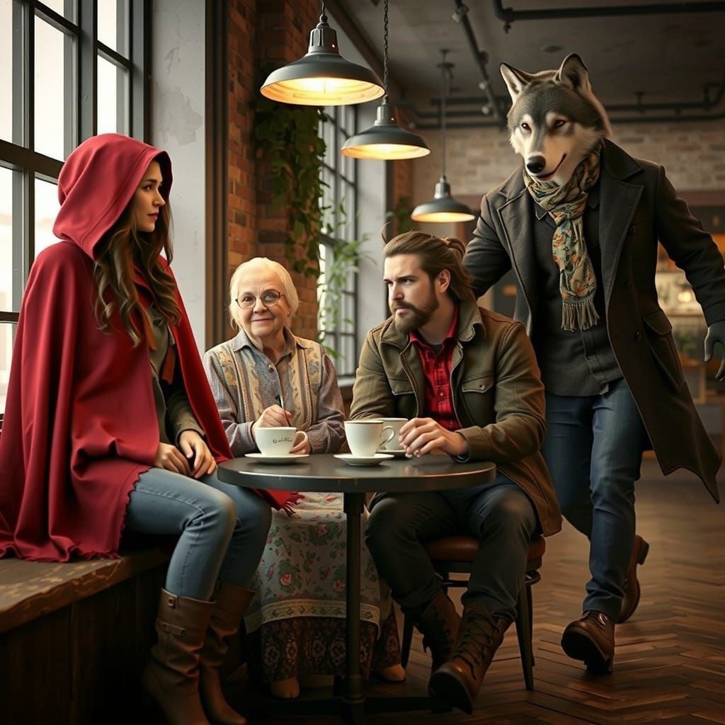 Hyperrealistic photograph of a young woman wearing an elegant red cape, a rustic man with an adventurous style, a classically-looking elderly woman, and an anthropomorphic character with wolf-like features, gathered in a modern café in the year 2025. The young woman, with long, dark, wavy hair, is wearing ...