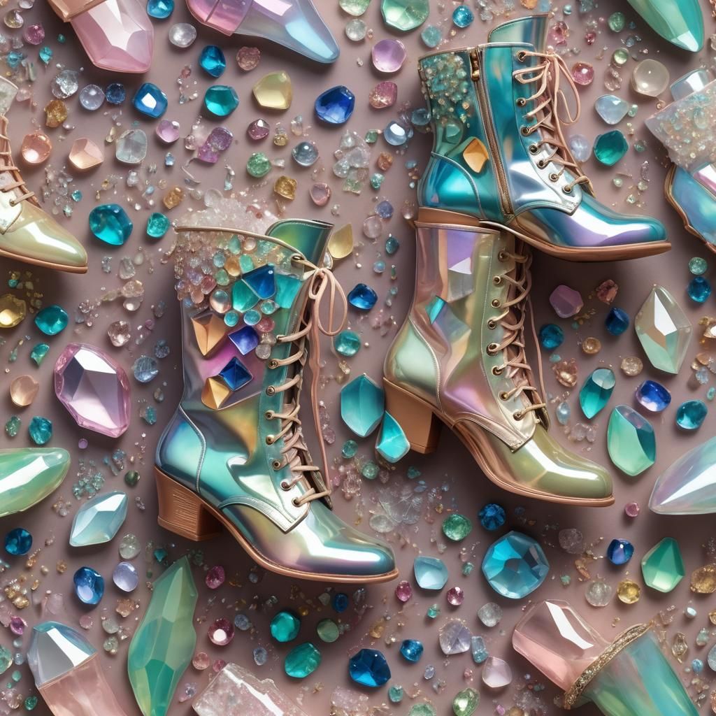 A shimmering image of rainbow crystal boots. The iridescent facets catch the light in soft pastel colors, creating an ethereal oil-slick sheen in a surreal pop art style.