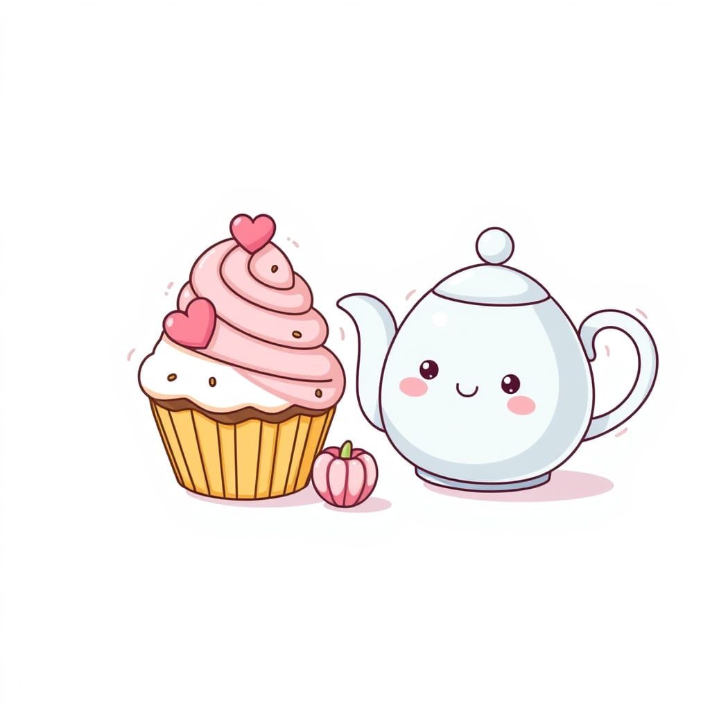 This image shows a cute storybook illustration of kawaii cupcakes and a kawaii teapot, all in soft pastel colors against a clean white background.