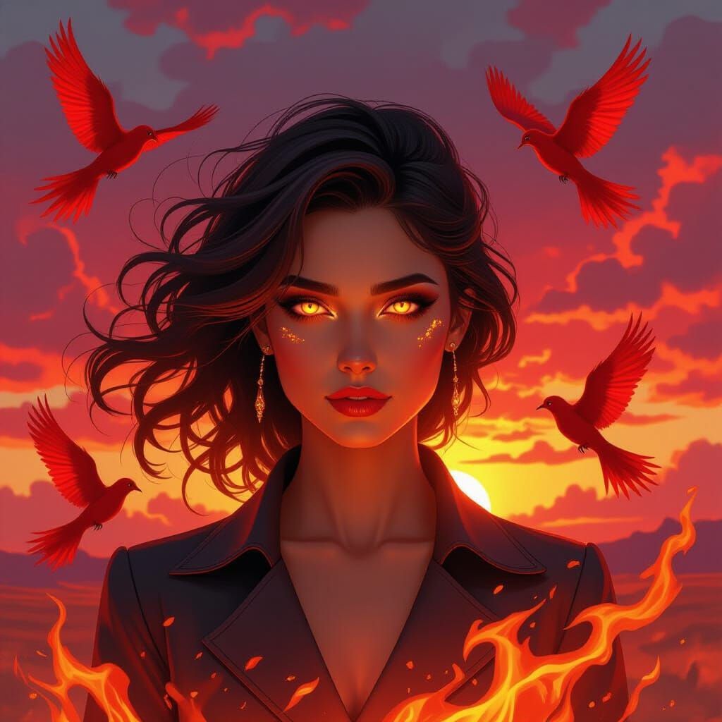 A portrait of a woman with golden eyes and fiery hair, encircled by firebirds against a sunset. The image has an expressive, painterly style with warm lighting.