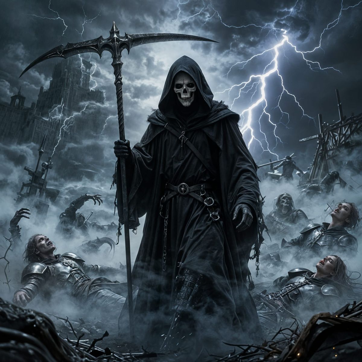 A grim reaper with a barely visible skull hidden in his hood, a scythe protruding from behind his shoulder, and a black habit fading into the mist against the backdrop of a thunderstorm. Twisted from the mist, terrified and suffering souls escape from the bodies of fantasy-style knights lying on the battlefield.